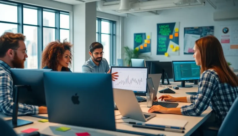 diverse professionals discussing a digital code in a modern office.